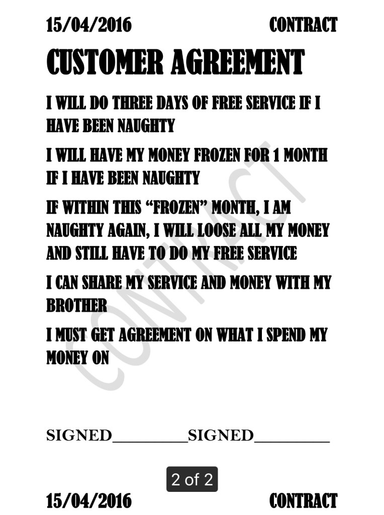 Arun was always trying to negotiate and do “deals” with us and his brother. He would often create contracts about getting paid for chores or increasing his bed time, in exchange for good behaviour!