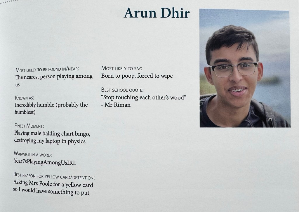 Arun was in Upper Sixth, which means he was going to leave school at the end of the year. And as part of that, every member of the U6 writes a few silly things about themselves which go into a leavers’ yearbook.
